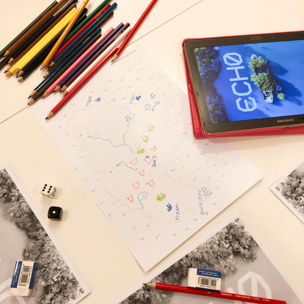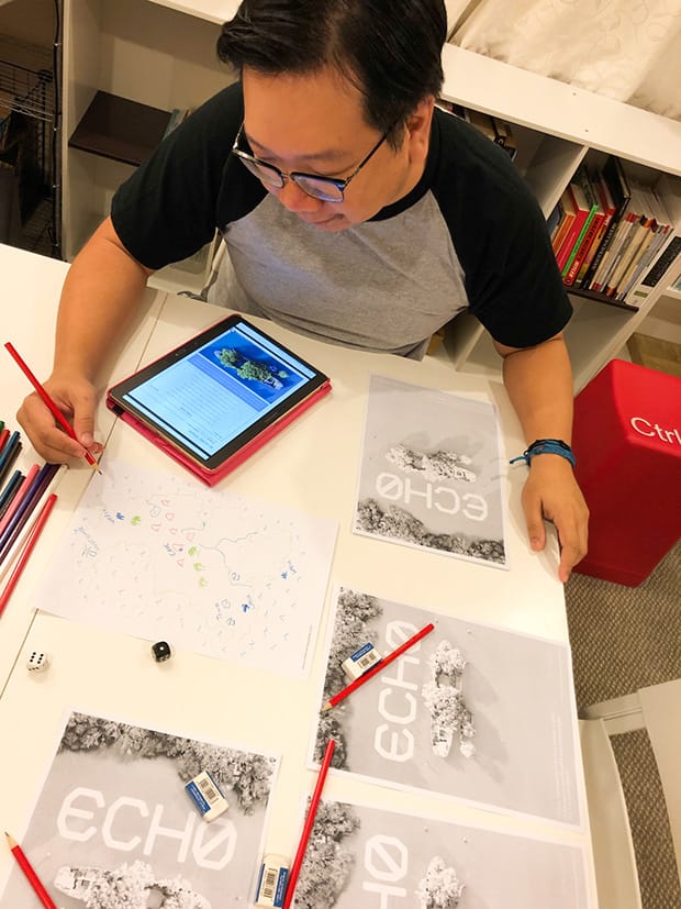 Kai: Ech0 is a simple map-making game where all the players share narrative agency. There are no dice rolls for action resolution, only for location prompts. It's a game about war where the fighting and dying has already happened a long time ago. Specifically, each kid describes the site of one of the fallen mecha as the group explores, but the dead pilot describes what happened in the past, for the children to react to. The text just provides tables of prompts, images and ideas to guide worldbuilding. This was when map games were still pretty new to me. Apart from the work of Avery Alder and Takuma Okada, there wasn't much that I knew of. My partner Elisha and I were pretty much fumbling around in the dark when we made this.