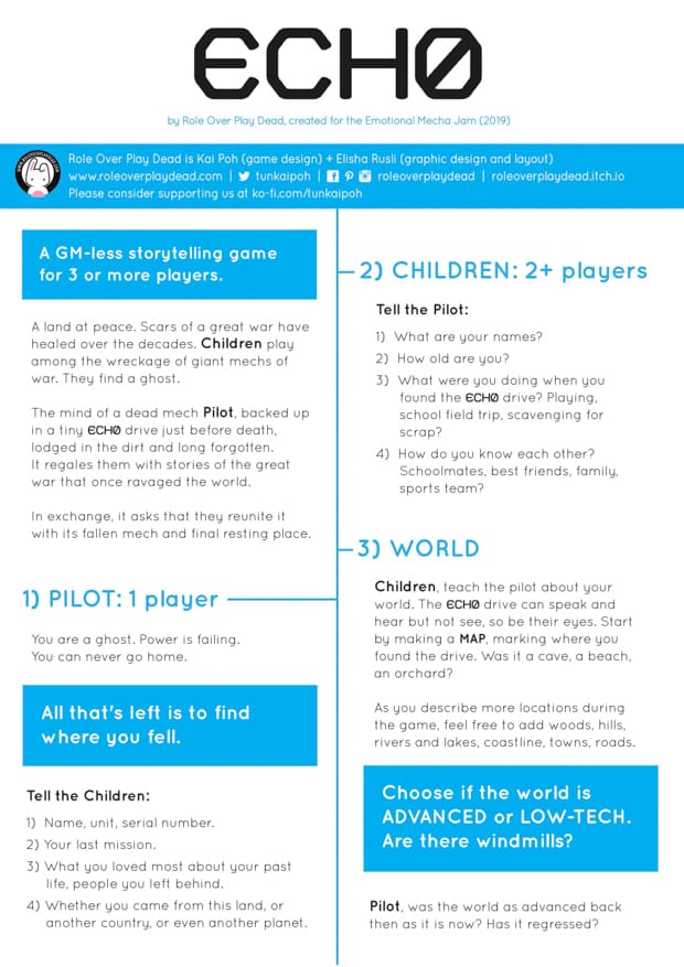 The emotional mecha game jam is a historical jam, one that had an influence not only on itch as a platform for ttrpgs but also on ttrpg design more broadly. I've wanted to feature ECH0 since the release of this newsletter as one of my favorite games from that jam. Kai Poh was kind enough to revisit this game with me and answer a few of my questions.