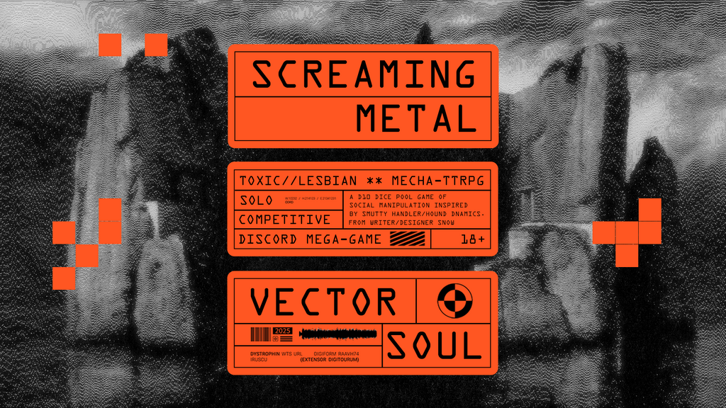 Screaming Metal is coming to Backerkit. It's a mecha ttrpg about toxic lesbians piloting living machines for exorbitant amounts of money so they can live lavish lifestyles before being torn to shreds by the poisonous arms of hyperspace. Solo or competitive.