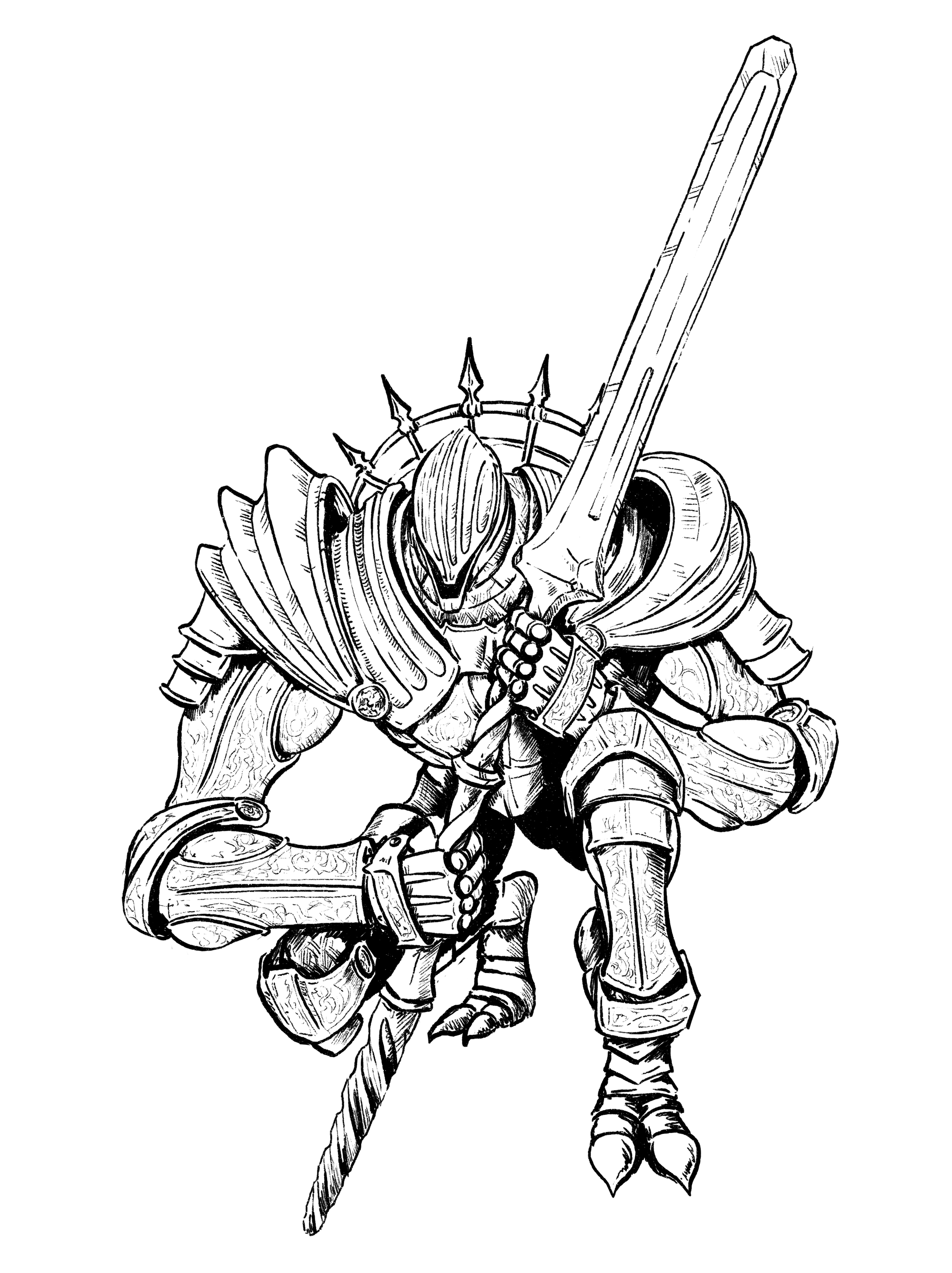 Galen: It's quite likely that folks who read a mecha newsletter already know this, but most every mech is a kind of figure who sits somewhere on a grid between the points of FIGHTER PLANE/TANK/ANGEL. A lot of the fun of this job is talking it through with the customer and finding out what that figure is, and where that mecha goes on the grid. For example, the first figure below, from an as-yet unannounced project, is a swordsman+tank, while the second figure, from The Facility, is a monster+angel. Once you've got the concept, assembling a series of references, then sketches, and then paints, is just a whole lot of time spent squinting at a tablet.