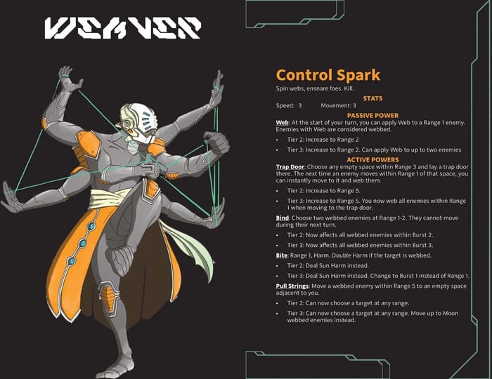 Second was giving players more control over how their Spark is set up. There is a new stat called Capacity, which is basically the number of combined powers and mods your Spark can equip. This allows players a lot of flexibility with how they build their Spark. They could just jam their Spark full of powers, giving them a wide array of things to do, but all of them at a sort of "entry level." Or, they could pick a couple powers and load up on mods. Now they are much more specialized, but really good at what they do. This is also a tool to help folks find a playstyle that fits their preferred cognitive load. If you like a lot of options, you can give your character that. If you want just one or two buttons to consider on your turn, that's totally viable as well.