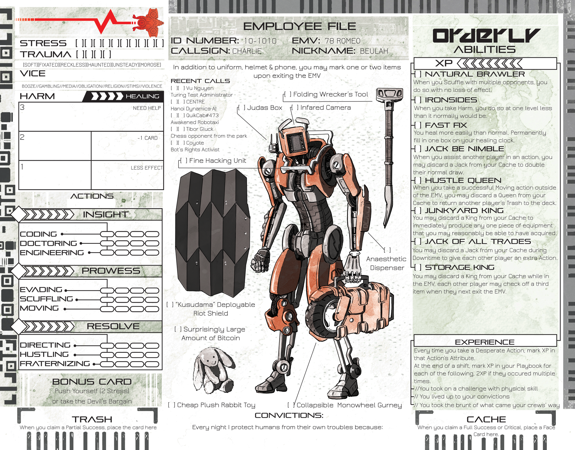Galen: In the margins of my school notebooks, like a lot of kids, I imagine. Professionally, I got into drawing on the net back in 2017, as a way to fight deal with insomnia and a newborn. Some folks on the internet liked my drawings, so I just kept plugging away, and eventually made a Blades in the Dark hack called Crash//Cart. The character "Charlie" was my first published robot.